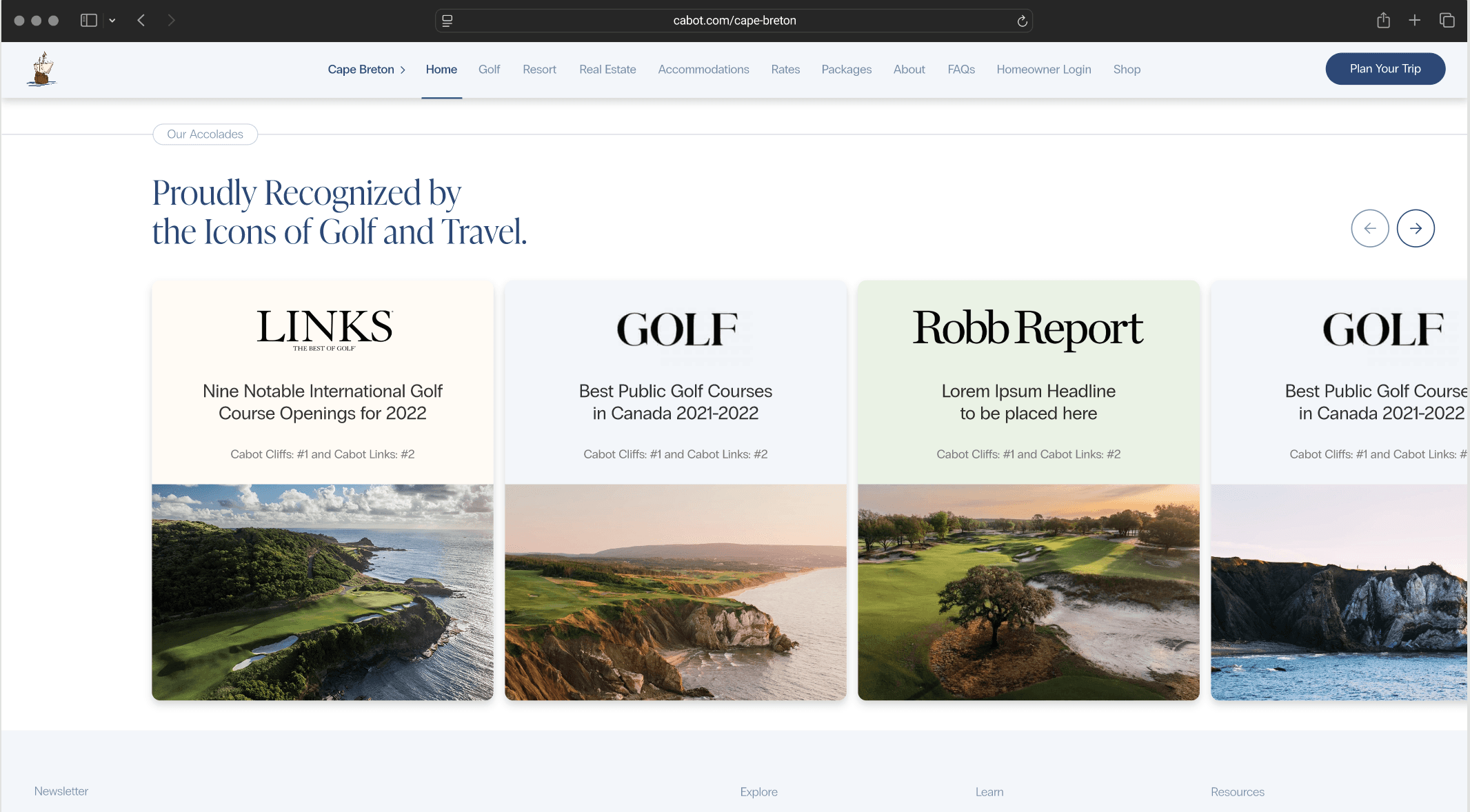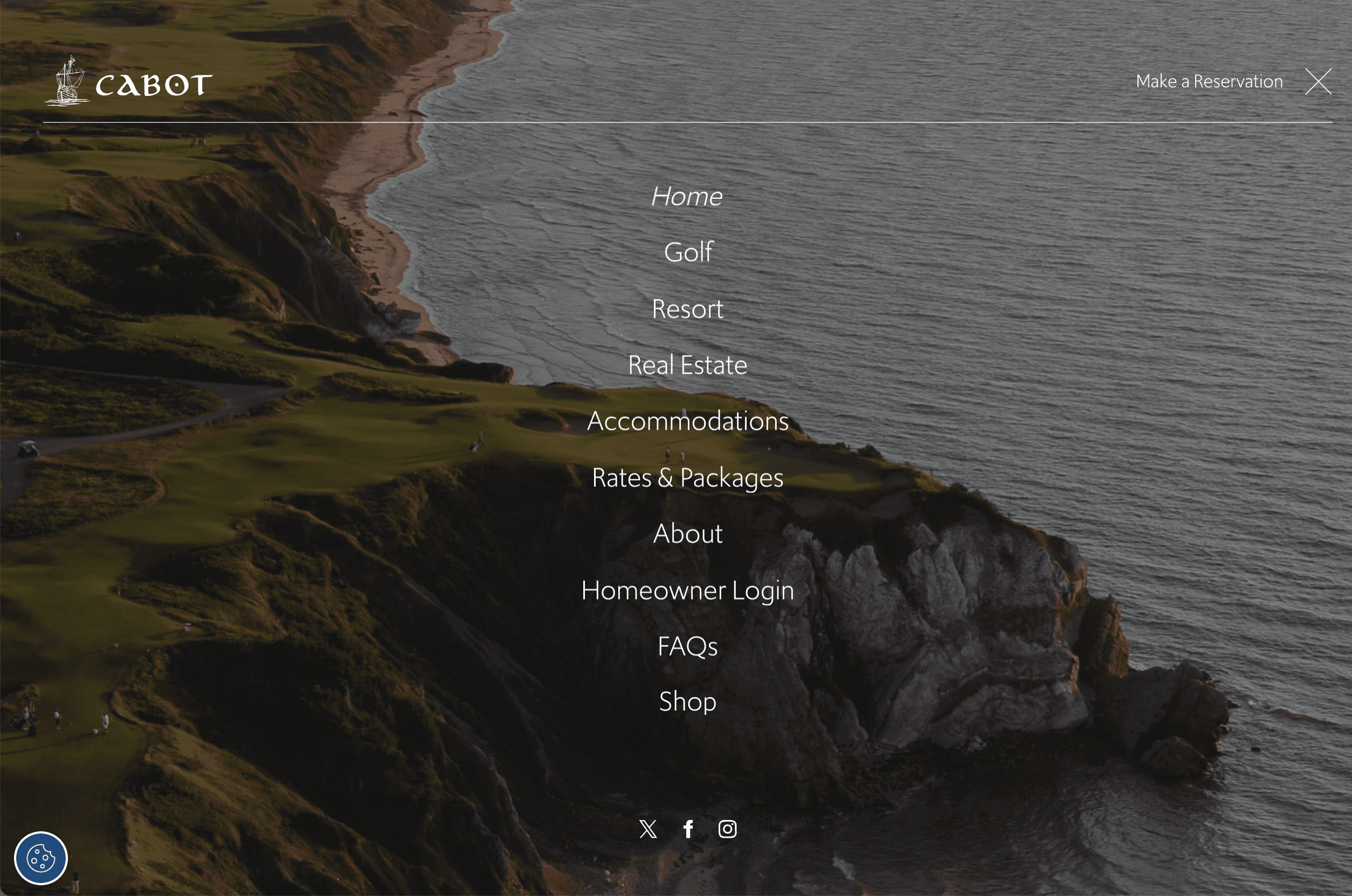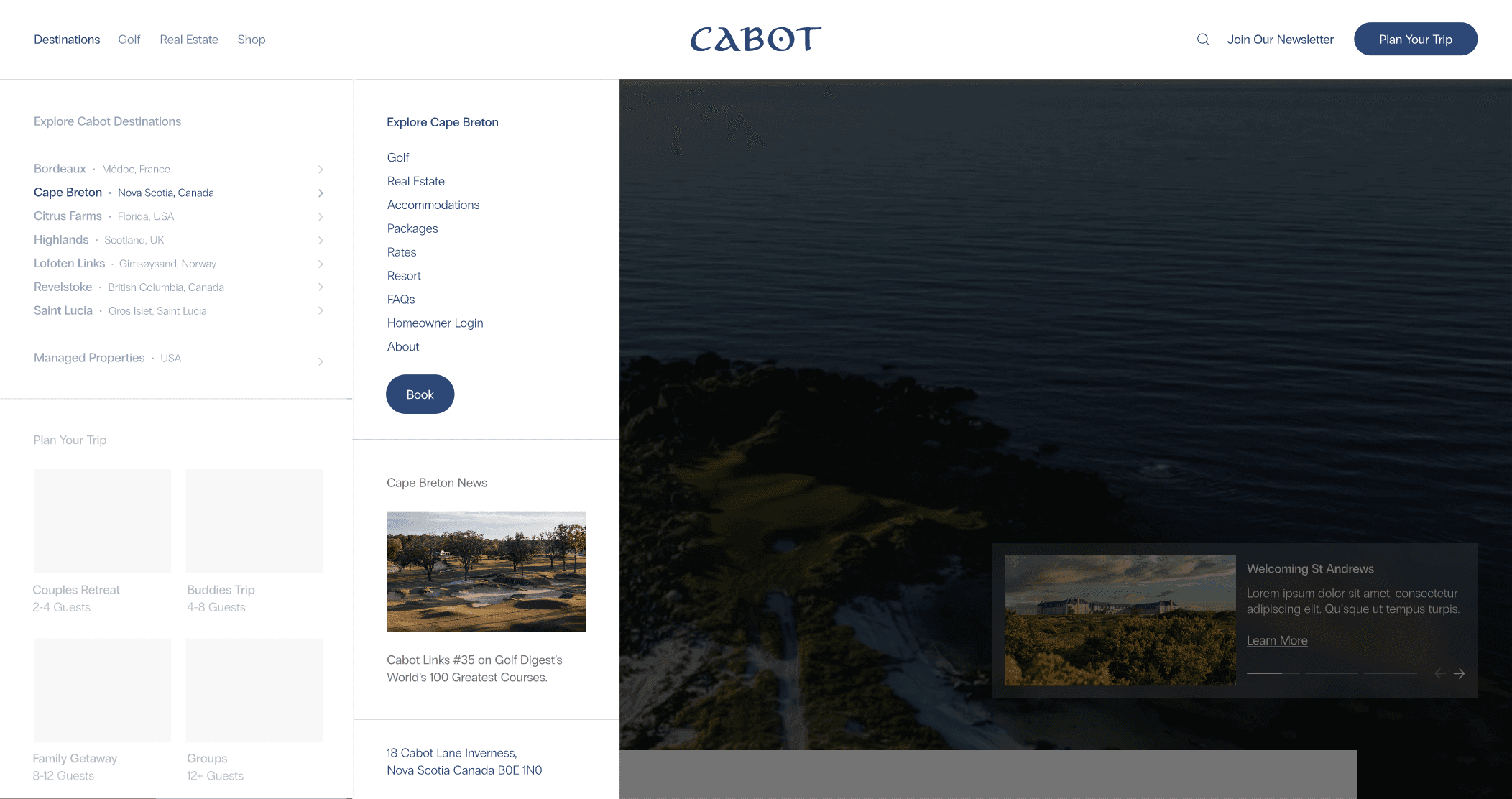 Restructured site navigation by introducing primary and secondary menus that clarified Cabot's core verticals (golf, hospitality, and real estate) while surfacing previously buried e-commerce and key calls-to-action.